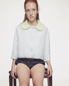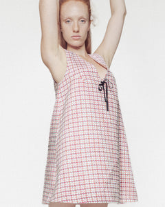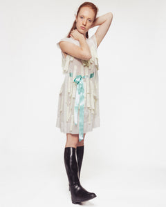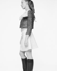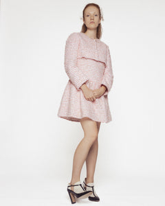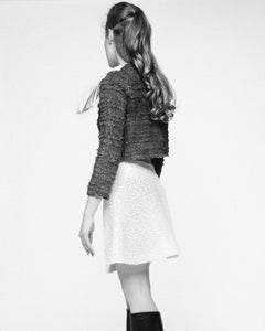 The Spring Summer 2026 collection brings about a vibrant assortment of colors to add life to one’s Spring Summer wardrobe. Debuting a selection of artisanal pieces, one in particular, made of recycled tweed covered buttons on a backing of sculptural tarlatan. There is also a child’s christening dress repurposed and covered with strips of starched tweed with a silky blue tie. Old jackets were reinvented with alterations and fabric dyes to add an electric yellow collar on one and a lively pink silk faille bow woven into another.